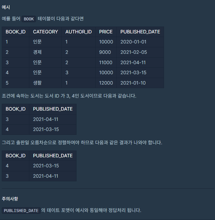 문제 자체는 답을 내기는 쉽지만, mysql과 oracle에서의 date 포맷하는 방법과 조건절에 date형식을 어떻게 처리할 지에 대해 생각해 볼 수 있어서 재밌는 문제였습니다.