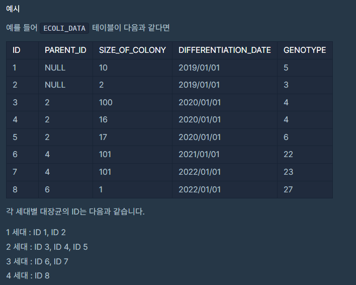 훑어서 읽고 쭉쭉 내려서 예시를 보니 각 id별로 부모가되는 parent_id를 가지고 있고, 하나의 레벨(재귀깊이)를 세대라는 용어로 표현하고 있습니다.