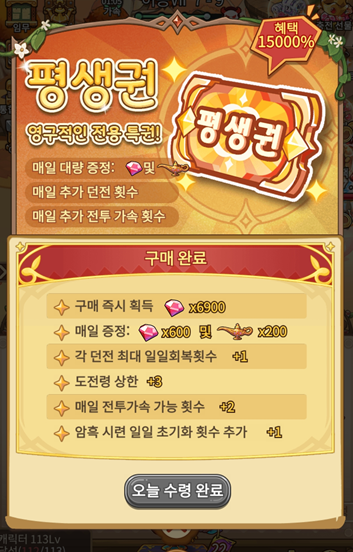 한번 구매하면 일일 던전 횟수와 전투가속, 시련 초기화 횟수 추가 등 여러 혜택을 영구적으로 이용가능합니다.