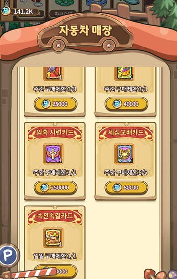 무려.. 250,000 버섯카 코인이 듭니다. 물론 주차장에서 구매한 시련카드는 누적이 되서 나중에 한번에 스펙업하는데 쓰이기도 하지만.. 평생권으로 매일 시련 초기화를 하는건 엄청난 가치입니다ㅎㅎ