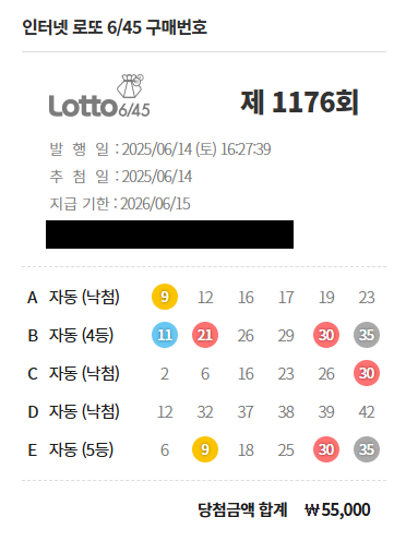 - 1176회(2025년 6월 14일 기준) 4등 당첨금: 50,000원