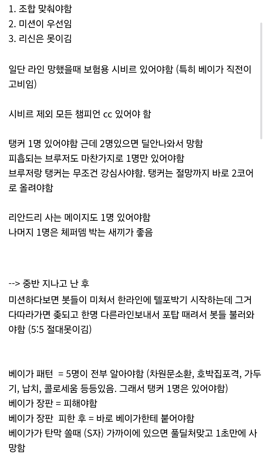 - 키 아이템 완성 타이밍 전까지는 절대 무리하지 말고, 팀과 함께 움직이면서 베이가의 ‘죽음의 세계’(모데카이저 R) 등에 당하지 않도록 각자 담당 구역과 라인을 명확히 조율해야 합니다.