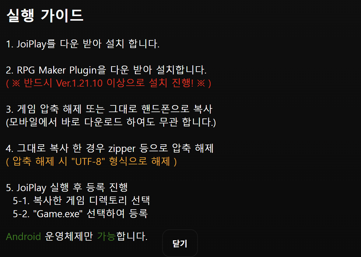 | 모바일 실행 방법 | JoiPlay+RPG Maker Plugin 설치 → 파일 옮기기 후 실행 |