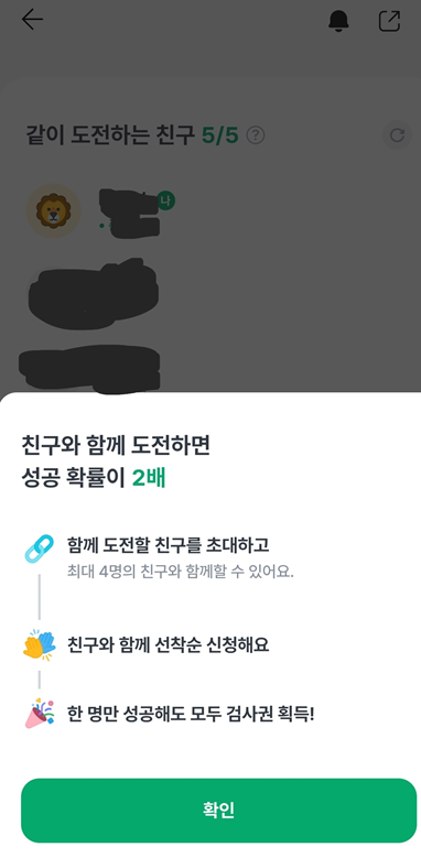 친구 5명이서 한팀이서 한명만 성공해도 모두 받을 수 있는 기능이 있으니 꼭꼭 같이하세요!!😍